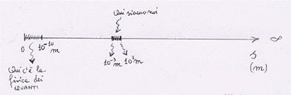 Dico a parole ciò che ho rappresentato. Noi abbiamo la possibilità di controllare con i nostri sensi grandezze che vanno da un ordine di grandezza del millimetro ad un ordine di grandezza del chilometro. Noi non siamo in grado di capire, se non in modo forzatissimo, cosa sono i 100 chilometri o cosa è il millesimo di millimetro. Se poi scendiamo a lunghezze che sono più piccole del decimiliardesimo di metro, allora anche le leggi che regolano il nostro mondo macroscopico, debbono essere modificate e, da quelle parti, non vale più la fisica classica, quella di Newton, ma occorrono modifiche sostanziali che sono state introdotte nella fisica all’inizio del ‘900, con l’elaborazione della fisica dei Quanti. Sulle lunghezze e quindi distanze molto grandi, a livello cosmologico, tornerò più oltre.