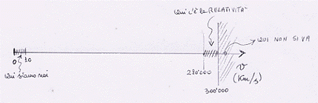 Un centometrista, l’uomo più veloce del mondo, si avvicina ai 10 m/s, cioè ad un centesimo di chilometro al secondo. Andare a 10 km/sec equivale alla velocità raggiunta dall’astronave andata sulla Luna, circa 36.000 Km/h! La velocità di un caccia moltiplicata per 10. Fuori da qui noi non sappiamo pensare altre velocità. Per velocità che invece ci offre la natura dobbiamo prendere atto di quel limite di cui dicevo. E per velocità vicine a quel limite, anche qui, le descrizioni che possiamo dare del mondo non tornano più con la fisica di Newton. Si è dovuta elaborare una nuova fisica, sempre agli inizi del ‘900, la Relatività ristretta.