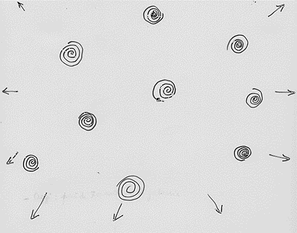 Altri due disegni, proposti da J. D. Barrow, tentano un avvicinamento a come funziona l’elaborazione cerebrale dei dati sensoriali. Nel primo, formato da anelli di punti, concentrici ed ugualmente spaziati; con ogni anello che contiene lo stesso numero di punti ed i punti di anelli alternati sono allineati in senso radiale. Da una parte quindi esistono queste strutture precostituite, dall’altra l’occhio percepisce tre schemi dominanti: anelli concentrici in prossimità del centro; “petali” di grandezza crescente ad una certa distanza dal centro; linee rette radiali vicino al perimetro.