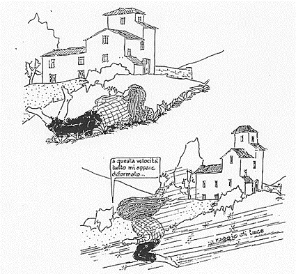 Ma ritorniamo alla gravitazione come distorsione dello spazio-tempo (sia dello spazio che del tempo) di cui parlavo poco fa. Questo è uno dei risultati che la complessa elaborazione matematica della Relatività Generale ci ha fornito. Naturalmente vi sono state ulteriori elaborazioni (che ancora oggi continuano) dopo quella di Einstein. Ma su questo punto specifico, tutte le teorie convergono: lo spazio è deformato dal campo gravitazionale ed il tempo scorre in modo differente a seconda dell’intensità del campo. Oggi, ad esempio, abbiamo una verifica sperimentale di questa ultima affermazione: sulle basi spaziali orbitanti intorno alla Terra, a causa della maggiore debolezza del campo gravitazionale, si misura un tempo che passa più velocemente rispetto alla Terra. Più forte è il campo gravitazionale, più il tempo trascorre piano. Vi sono delle stelle così grandi da avere una gravità che rallenta enormemente il tempo. E, come vedremo, poiché la gravità alle soglie di un buco nero è immensa, in questa zona il tempo inizierebbe a non scorrere più! Una tal situazione vista dalla Terra sarebbe una immagine congelata nell’immobilità. Ma una tal situazione non è visibile proprio perché la luce non può venirne fuori a causa di quella immensa gravità. Per questo quello è un buco nero: è uno di quei mostri di cui ho discusso in breve, una singolarità spazio-temporale. Questa distorsione dello spazio-tempo comporta che in un tempo che praticamente si va fermando, un oggetto che stia entrandovi si stirerebbe sempre più fino a ridursi ad uno spago. Un astronauta che vi entrasse per i piedi vedrebbe il suo corpo assottigliarsi sempre più a partire dai piedi verso la testa. Tutto ciò avverrebbe in un tempo lunghissimo; tutto tenderebbe rapidamente all’eternità. Lo sfortunato astronauta troverebbe la singolarità che rappresenta il confine del tempo e lì sparirebbe. La singolarità segnala la fine di un viaggio senza possibile ritorno verso nessuna parte ed in nessun momento. In un non luogo dove l’universo sparisce.