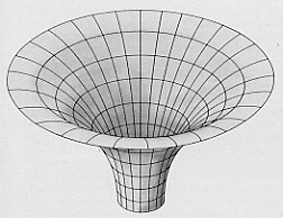 Vediamo, aiutandoci con un disegno, come sia possibile viaggiare nel tempo nel nostro spazio. Tale spazio è curvo nel senso più volte detto. Inoltre vi sono delle masse che lo deformano. Tanto più tali masse sono grandi (e non si confonda mai massa con volume: allo scopo si riveda l’ultima figura riportata) quanto più si addensano in volumi piccoli. Tali masse possono quindi essere enormi in volumi piccolissimi. E’, come già detto, il caso di un buco nero, di una singolarità. Un buco nero che si “aprisse” da un lato (come fino ad ora visto) potrebbe “sfociare” in un altro lato, in un altro punto dello spazio-tempo, originando quello che si chiama cunicolo (o, in alcune condizioni, verme). Un cunicolo elementare è quello mostrato di seguito: