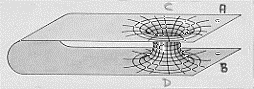 Supponiamo ora che, camminando lungo la striscia, la luce vada da A a B. Ciò rappresenterebbe un normale avanzare del tempo come ordinariamente lo conosciamo che va dal presente A al futuro B. Pensiamo ora a della luce che parte da A. Essa viene catturata dal cunicolo in C e va a finire prima in D (fuori dal cunicolo) e quindi in B. Alla fine la luce è andata da A a B ma attraverso il cunicolo, tagliando tutto il tempo necessario a percorrere lo spazio ordinario. Questo rappresenterebbe un viaggio nel futuro. Supponiamo ora che la luce, sempre partita da A, entri in C per andare in D e, da D, ritorni lungo lo spazio ordinario (la striscia) verso A. Questo rappresenterebbe un viaggio nel passato (prima andiamo nel futuro, D, e poi torniamo indietro verso A).