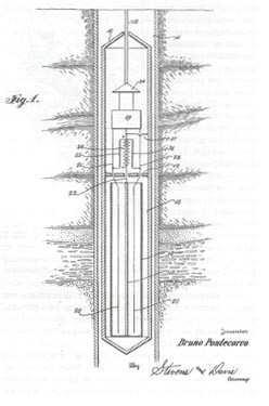 (20) Utilizzando una sorgente di neutroni, i diversi strati geologici di un pozzo venivano irradiati. La radiazione di ritorno veniva quindi registrata prima elettronicamente e poi graficamente. Il grafico così ottenuto mostrava le caratteristiche del pozzo (per esempio, la sua profondità) PONTECORVO B. e SWIFT G., “Geophysical prospecting”, P.N. US 2353619, 11 luglio 1944; PONTECORVO B., “Method of geophysical prospecting”, brevetto (P.N.) US 2508772, 23 maggio 1950; PONTECORVO B., “Well surveying”, P.N. US 2398324, 9 aprile 1946. Sullo stesso principio vedi anche PONTECORVO B., “Neutron well logging: a new geological method based on nuclear physics”, Oil and Gas Journal (1941), 40, pp. 32-3.