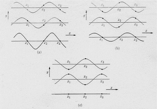 Come spiegare tale fenomeno? Con la teoria corpuscolare nulla da fare: i corpuscoli di luce o passano da una fenditura o dall’altra, con l’unico risultato possibile di originare due zone illuminate sullo schermo. Se invece si tiene conto che un’onda come quelle che abbiamo visto ha per sezione una sinusoide (si pensi ad un sasso che cade in uno stagno: dal punto dove entra nell’acqua si dipartono onde circolari ma, se guardiamo tali onde sezionando mentalmente l’acqua, si tratta di sinusoidi che partono da quel punto), allora si può capire come stanno le cose. Due onde sinusoidali della stessa ampiezza possono essere in fase (fig. 4a) e, se interferiscono, originano un’onda sinusoidale che è somma delle sue sinusoidi componenti: Due onde sinusoidali possono essere in controfase (fig. 4 c) e, se interferiscono, originano un’onda nulla. Vi sono poi tutti i possibili casi intermedi (fig. 4 b).