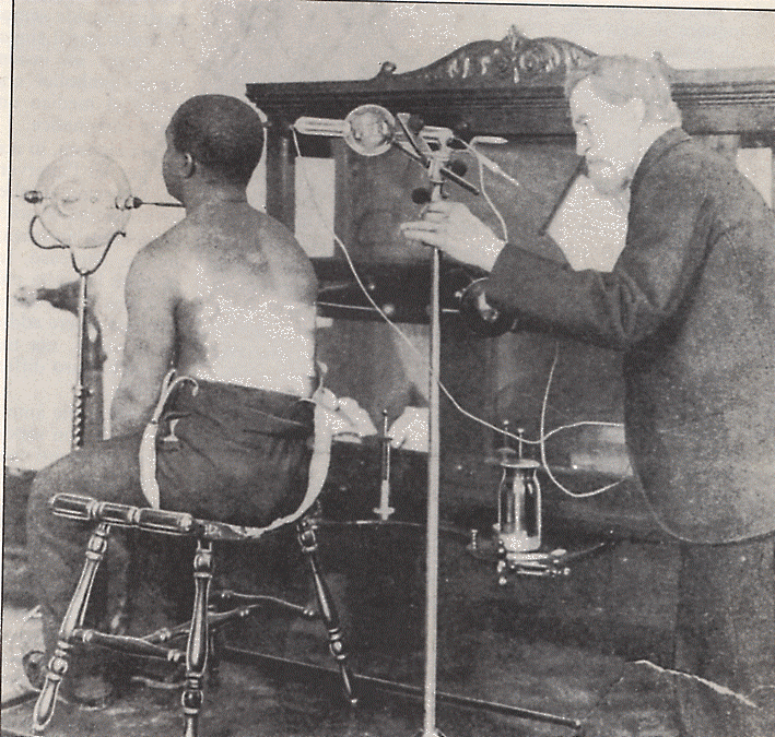 A questo punto il Sig. Forbin fa una breve storia dell’impresa del medico di Filadelfia: egli, all’inizio, non si era specializzato nello sbiancamento dei negri ma nell’eliminare le voglie di vino o altre colorazioni anomale ai bianchi. Ma, dopo i soddisfacenti risultati conseguiti con un negro adulto, al quale era riuscito a sbiancare sensibilmente la faccia, capì che doveva proseguire su questa strada. Il procedimento era poi semplicissimo: sottoporsi all’azione dei raggi X in diverse sedute successive. Testimoni degni di fede assicurano di aver assistito agli esperimenti. Essi raccontano: dopo una decina di sedute, la pelle di un negro originario dell’Africa centrale già assumeva una colorazione marrone chiaro. Prolungando il trattamento si otteneva una tinta olivastra. Con certi soggetti l’opacità della pelle diventava come quella di un creolo. Alla trentina (e passa) di trattamenti si raggiungeva lo scopo, proprio a tempo perché pare che a quel punto la resistenza fisica dei soggetti venisse meno. In ogni caso la tinta ottenuta per trattamenti prolungati era un bel bianco malato (con l’espressione del Sig. Forbin).