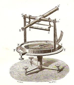 Una bussola per misurare la declinazione magnetica (il piccolo telescopio serve per puntare una stella che indica il nord ed è possibile fissare tale posizione facendo ruotare la bussola sulla superficie su cui poggia. La posizione dell’ago della bussola rispetto a quella segnata precedentemente fornisce l’angolo di declinazione).