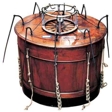 Una bussola a sospensione cardanica (circa 1570). Come in un giroscopio, gli anelli metallici che sostengono la bussola possono ruotare o oscillare a piacere, la bussola, che nella sua parte più bassa è zavorrata, resta immobile all’interno.
