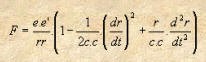 sono rispettivamente la velocità e l’accelerazione delle cariche. A parte qualche fattore numerico, la differenza tra le due leggi sta nel denominatore della seconda. In esso al prodotto rr è sottratta una quantità che è il prodotto di una r per una quantità che deve avere (ed ha) le dimensioni di una lunghezza.