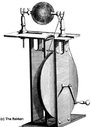 (16) Altre macchine furono realizzate in quel periodo, come quella di Martinus van Marum (1750-1837) del 1784, con dischi in vetro di 165 cm di diametro (con un condensatore di 21 metri quadrati costituito da una batteria di bottiglie di Leida, in grado di produrre 300 scariche al minuto (circa 60kV) e scintille lunghe 60 cm e larghe fino a 40 cm. Ma quella di maggior successo fu costruita nel 1766 da Jesse Ramsden (1735-1800). Egli sostituì al cilindro di vetro un disco della stessa sostanza strofinato da quattro cuscinetti. Da allora la macchina di Ramsden rimase in voga per circa un secolo, perfezionata da John Cuthbertson (1743-1806), e fu la prima macchina elettrica largamente conosciuta ed utilizzata.
