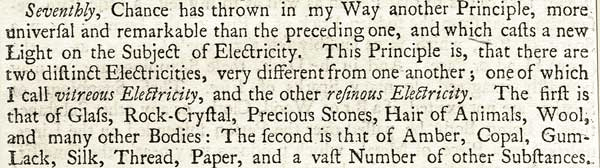 Ecco dunque costantemente due elettricità di natura completamente diversa, cioè quella dei corpi trasparenti e solidi come il vetro, il cristallo, ecc., e quella dei corpi bitumosi o resinosi, come l’ambra, la gomma coppale, la cera di Spagna, ecc. Gli uni e gli altri respingono i corpi che hanno acquistato un’elettricità della stessa natura della loro e attraggono invece quelli la cui elettricità è di natura diversa… I corpi che attualmente non sono elettrici possono acquisire (se sono isolati) ciascuna di queste due elettricità e allora i loro effetti sono simili a quelli dei corpi che gliel’hanno trasmessa… Ecco dunque due elettricità ben dimostrate… Chiamerò l’una elettricità resinosa, l’altra elettricità vitrea.