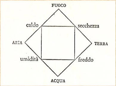 (si noti che, in accordo con la visione aristotelica del mondo che lo vuole ordinato secondo i gradi dell’intrinseca nobiltà dei quattro elementi – in successione, terra, acqua, aria, fuoco – il passaggio da un elemento a quello che lo segue nella scala di nobiltà avviene mediante il cambiamento di una sola delle qualità elementari). Questo modo di definire le cose fa sì che, mediante lo scambio di almeno una delle qualità primarie nel suo opposto, è possibile che un elemento si trasformi in un altro (sono più facili gli scambi di una sola delle qualità primarie ma non sono esclusi gli scambi di ambedue). Risulta semplice la trasformazione di acqua in aria (o viceversa) e altrettanto facile è quella da aria a fuoco (eccetera). Risulta difficile la trasformazione da aria in terra (o viceversa). Cosicché gli elementi non sono immutabili ma trasformabili gli uni negli altri. La figura seguente riporta uno schema delle più probabili trasformazioni:
