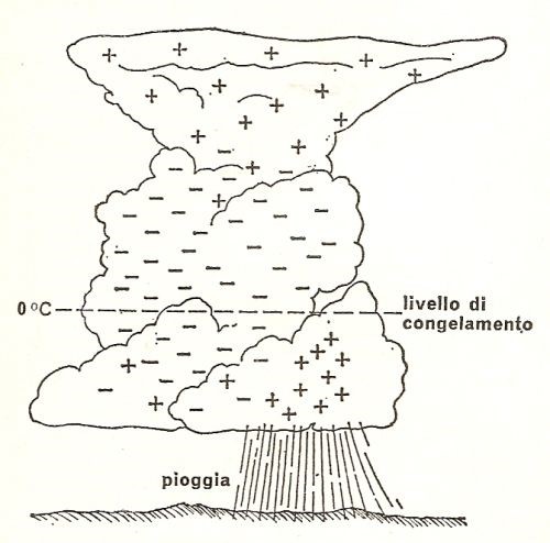 La prima teoria si fonda sull’osservazione che quando goccioline d’acqua molto disperse cominciano a solidificare, tra acqua e ghiaccio si forma una elevata differenza di potenziale, il ghiaccio acquista carica elettrica negativa mentre l’acqua acquista carica elettrica positiva. Seguo ora quanto scrive Battan: “Si immagina che le circostanze adatte per la creazione di centri di cariche elettriche in nubi temporalesche si abbiano quando un chicco di grandine raccoglie più acqua di quanta possa solidificarsi immediatamente. Dopo che la solidificazione ha avuto inizio una parte dell’acqua è portata via dall’aria che circola intorno al chicco e le minuscole goccioline d’acqua vengono portate verso l’alto dove vanno a formare la parte superiore della nube carica positivamente, mentre le grosse particelle di ghiaccio cadono a quote più basse. Questo processo spiega le caratteristiche principali della distribuzione delle cariche elettriche rappresentata nella figura precedente. Esperimenti eseguiti in laboratorio hanno anche dimostrato che l’attrito fra due particelle di ghiaccio provoca un trasferimento di carica elettrica se una delle particelle di ghiaccio si riscalda più dell’altra”.