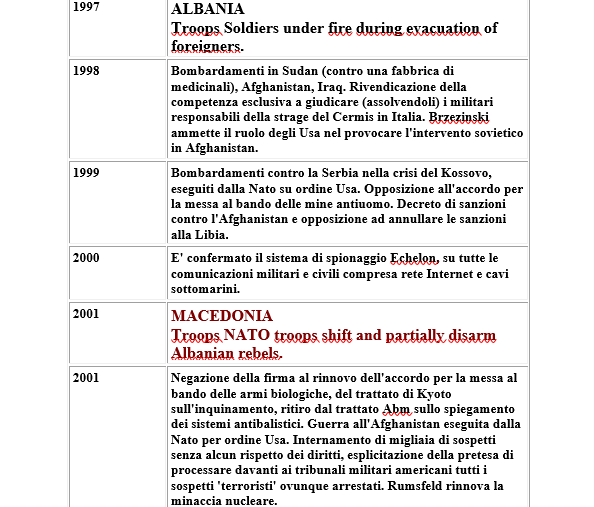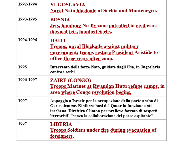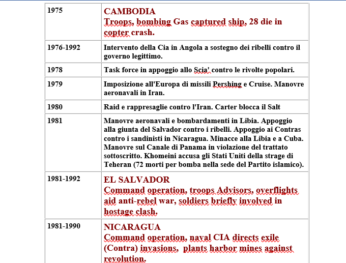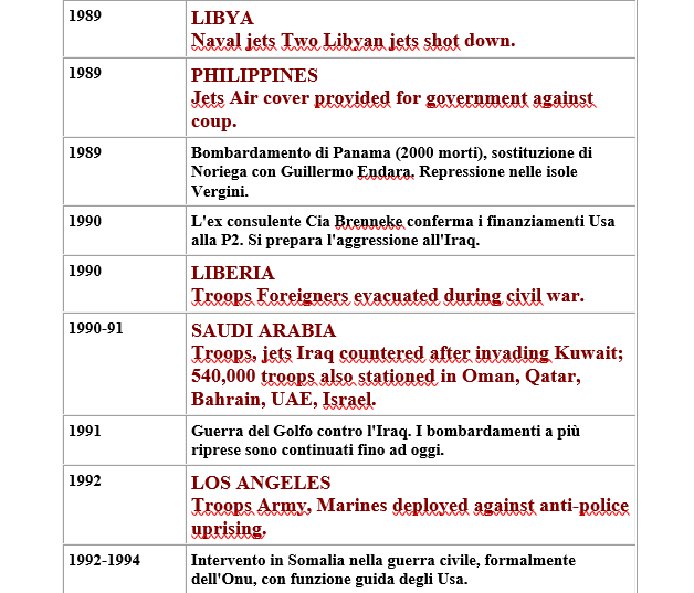 Fu Dean Rusk, segretario di Stato di John Fitzgerald Kennedy, a smentire nel 1962 davanti al Senato americano l’immagine idilliaca di un paese isolazionista, ripiegato su se stesso fino alle guerre mondiali. Con un documento eccezionale di cui riproduciamo la prima parte: la cronologia delle 168 operazioni all’estero compiute dagli Stati uniti tra il 1798 e il 1945