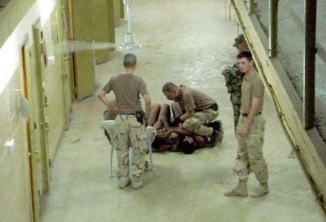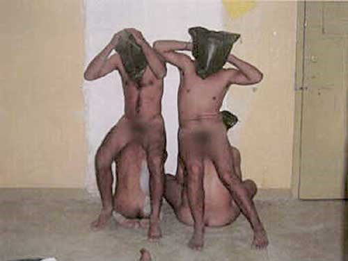 – atti di umiliazione come essere obbligati a stare in piedi nudi contro la parete della cella o con biancheria intima femminile sulla testa per periodi di tempo prolungati anche alla presenza di guardie di sesso femminile e talvolta fotografati in queste posizioni;