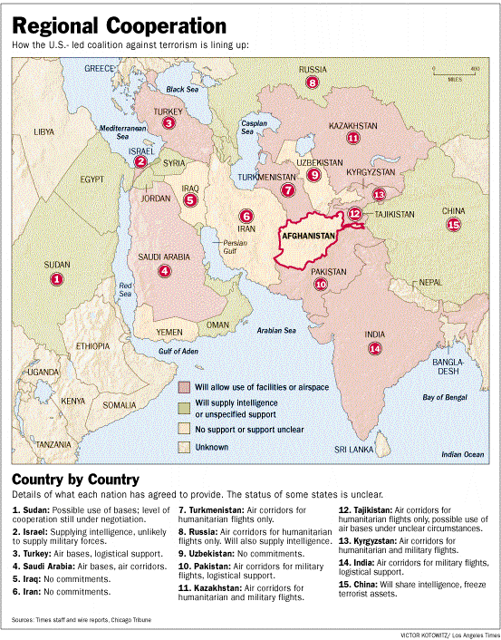 La prima è una carta dell’Asia. Sulla sinistra in basso, sopra l’India e quindi il Pakistan si vede l’Afghanistan. Quella miserabile striscia di terra impedisce che gli oleodotti e gasdotti provenienti dai ricchissimi giacimenti del Caspio, possano raggiungere il Mar Arabico. Se si fa attenzione, si scopre che i giacimenti sono in ex repubbliche sovietiche che si trovano al di sopra dell’Afghanistan. Tali repubbliche hanno concesso basi agli USA per attaccare l’Afghanistan con il beneplacito di Mosca. Ma l’accordo con la Russia prevedeva che, terminate le operazioni di guerra, le basi USA fossero smantellate. Così non è stato ed ora, forse troppo tardi, la Russia si accorge di essere accerchiata dagli USA (ad Est la Nato arriva fino ai suoi confini, al Sud ormai le basi americane incombono minacciosamente e ad Ovest e a Nord vi è il Pacifico e l’Artico che dividono la Russia dagli USA).