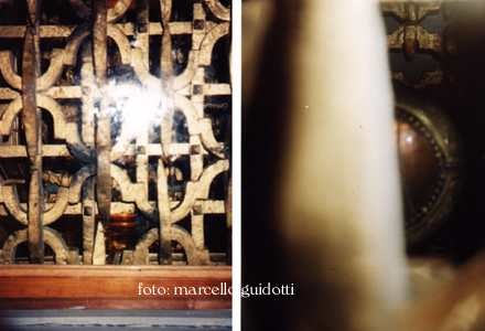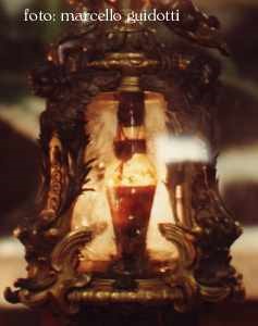 ampolla contenente la reliquia di San Pantaleone allo stato di gel. La maglia molto fitta dell’inferriata posta a perenne protezione della reliquia, impedisce di ottenere una fotografia più dettagliata e rende difficoltosa l’osservazione