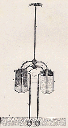 Riporto uno schema animato di una pompa idraulica per rendersi rapidamente conto del suo funzionamento. Una macchina a vapore doveva azionare la leva di una tal pompa con continuità, sollevando l’acqua alla superficie del suolo.