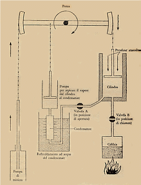 Riferendoci alla figura 17a è da notare: la grande caldaia che presentava una superficie riscaldante maggiore (C), il cilindro dotato di camicia di vapore (E), il condensatore separato (F). Riferendoci alla figura 17b possiamo descrivere il principio di funzionamento della macchina. Il vapore prodotto dalla caldaia entra nel cilindro e solleva il pistone (in tale fase la valvola B è aperta e la A è chiusa). Appena il pistone è arrivato alla sommità del cilindro si chiude B e si apre A: una pompa aspira il vapore dal cilindro. Il cilindro scende in basso ad opera della pressione atmosferica (Il cilindro mosso dal solo vapore sarà in un modello di macchina successivo). Il vapore aspirato va nel condensatore per ritornare allo stato liquido. Si riapre la valvola B e si richiude la A per iniziare un nuovo ciclo. Nel frattempo l’asta del pistone fa lavoro (in questo caso) attraverso l’oscillazione del bilanciere che aziona la pompa della miniera. Il bilanciere, come lavoro secondario, aziona anche la pompa che aspira il vapore dal cilindro.