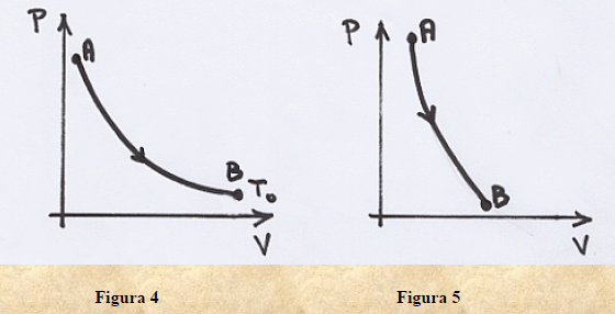 Una trasformazione è adiabatica, quando si realizza in un sistema che non scambi calore con l’ambiente esterno. Si passa quindi da uno stato di equilibrio A ad uno B, facendo variare pressione e/o volume e/o temperatura ma mantenendo l’isolamento totale con l’ambiente esterno. In un piano P,V tale trasformazione si rappresenta con una curva un poco più complessa di una iperbole equilatera (Fig. 5), avendo per equazione la funzione P.Vg = costante (dove l’esponente g è il rapporto cp/cv tra i calori specifici a pressione costante ed a volume costante del gas che subisce la trasformazione; tale quantità vale circa 2)(0). Osservando che l’entropia è definita come DS = DQ/T, essendo invece l’adiabatica una trasformazione a DQ = 0, per l’entropia, in una adiabatica, risulta: DS = 0. Ciò vuol dire che non vi sono variazioni di entropia e quindi che l’entropia dello stato finale coincide con quella dello stato iniziale del sistema. Ciò fa chiamare le trasformazioni adiabatiche anche isoentropiche. Osservo a margine che proprio questa ultima proprietà di queste trasformazioni, fa capire che esse sono trasformazioni ideali, non esistenti in natura, ma utili come limite superiore alla realizzazione di una certa trasformazione.