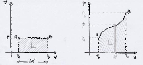 ascisse e i segmenti di perpendicolare tracciati dagli estremi della curva che fornisce il lavoro fatto (o ottenuto). La figura II mostra tratteggiata l’area che rappresenta il lavoro (fatto o ottenuto) per una trasformazione AB generica. Dal punto di vista del calcolo, tenuto conto che ora la pressione non è una costante ma una funzione del volume p(V), occorre passare a quello integrale, come somma di infiniti contributi infinitesimi:
