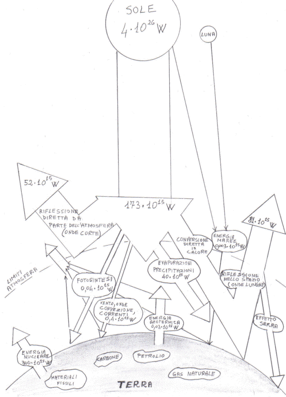 Della radiazione che il Sole ci ha inviato da molti secoli a questa parte, ne ritroviamo una piccola quantità nei combustibili fossili (carbone, petrolio, gas naturale). Questi materiali si sono originati da successive trasformazioni di piante ed animali che avevano accumulato energia dal Sole utilizzando, direttamente od indirettamente, il fenomeno della fotosintesi. Quando noi oggi bruciamo questi combustibili, di fatto, consumiamo un’eredità solare, accumulatasi in milioni di anni, che difficilmente potrà essere ricostituita in tempi ragionevoli per il suo ulteriore sfruttamento da parte dell’uomo. Ma vediamo più in dettaglio, aiutandoci con le figure 1,  2 e 3, qual é il flusso di energia che interessa la Terra.