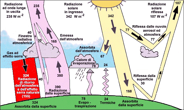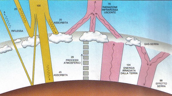 La Terra, per parte sua, irradia energia nello spazio circostante sotto forma di onde lunghe. L’energia che la superficie della Terra manda verso l’esterno è addirittura più grande di quella che entra. Fortunatamente (su questo avverbio tornerò più oltre) l’effetto serra (vedi il paragrafo seguente), prodotto dell’atmosfera, trattiene la gran parte di questa energia sotto forma di onde lunghe e, dopo aver riscaldato Terra ed atmosfera, se ne va una quantità di energia pari a 81 x 1015 W (circa il 47% di quella che avevamo in ingresso ai limiti dell’atmosfera).