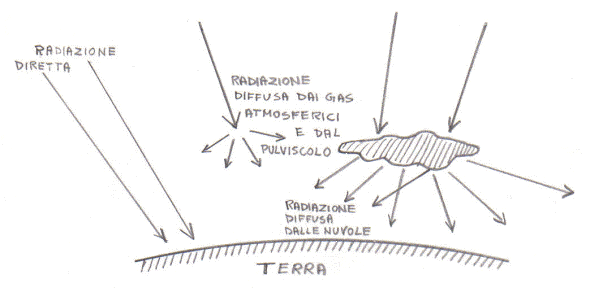Solo circa il 51% della radiazione che abbiamo ai limiti dell’atmosfera riesce ad arrivare sulla superficie terrestre e, di questa quantità, una metà è radiazione solare diretta mentre l’altra metà è radiazione solare che è stata diffusa dalle nuvole e dai gas costituenti l’atmosfera (figura 4). Di questo 51% una parte (circa il 10%) viene subito