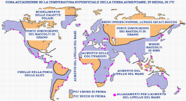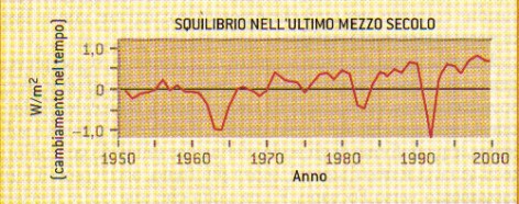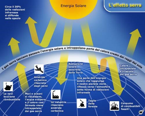 miliardi di tonnellate ogni anno di anidride carbonica nell’atmosfera (si tenga anche conto che le foreste, che ordinariamente assorbono anidride carbonica, sono diminuite e continuano ad essere aggredite da speculazioni ed incendi) ed abbiamo la necessità di ridurre la quantità di anidride carbonica presente nell’atmosfera di un 60% per ritornare all’equilibrio tra emissione ed assorbimento. L’ effetto serra naturale che forniva 170 W/m2 è cresciuto negli ultimi anni di 2,8 W/m (di cui 0,25 per attività solare extra e 0,25 per attività vulcanica extra). Questa cifra è accompagnata da un’altra cifra fornita dal Comitato Intergovernativo sui Cambiamenti Climatici (Intergovernmental Panel on Climate Change, IPCC) il quale afferma che la temperatura media del pianeta sia aumentata di circa 0,6°C dal 1861 (leggi relazione IPCC). Tutto questo può sembrare poco ma non lo è. Non è infatti il cambiamento del clima che dà le maggiori preoccupazioni ma la velocità di tale cambiamento, il tempo necessario agli adattamenti, e, nella scala dei tempi della Terra, 150 anni sono ben poca cosa, soprattutto se si tiene conto che l’accelerazione è degli ultimi 50 anni.