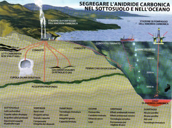 Ma vi sono altre strade (oltre all’ indispensabile abbattimento delle quantità emesse, attraverso energie alternative, efficienza, nuove tecnologie mirate, …) per la riduzione dell’emissione dei gas serra, ad esempio quella del convogliare l’anidride carbonica, dagli impianti produttori nel sottosuolo o nel fondo degli oceani, come mostrato in figura 8.