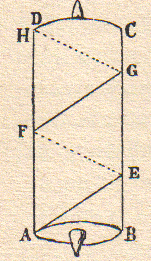 E tale fu la sua prima origine: che considerando, qual si fosse il suo primo inventore, come il triangolo ABC, venendo inanzi, solleva il peso D, si poteva fabricare uno instrumento simile al detto triangolo, di qualche materia ben salda, il quale, spinto inanzi, elevasse il proposto peso: ma considerando poi meglio come una tal machina si poteva ridurre in forma assai più picciola e comoda, preso il medesimo triangolo, lo circondò ed avvolse intorno al cilindro ABCD; in maniera che l’altezza del detto triangolo, cioè, la linea GB, faceva F altezza del cilindro, ed il piano ascendente generava sopra il detto cilindro la linea elica disegnata per la linea AEFGH, che volgarmente addomandiamo il verme della vite: ed in questa varietà si genera l’instrumento da’ Greci detto coclea, e da noi vite, il quale volgendosi a torno viene co’l suo verme subintrando al peso, e con facilità lo solleva.