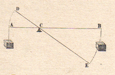 Però che, considerisi la libra AB divisa in parti diseguali nel punto C, ed i pesi, della medesima proporzione che hanno le distanze BC, CA. alternatamente sospesi dalli punti A,B : è già manifesto come l’uno contrapeserà l’altro, e, per consequenza, come, se a uno di essi fusse aggiunto un minimo momento di gravità, si moverebbe al basso inalzando l’altro; sì che, aggiunto insensibile peso al grave B, si moveria la libra, discendendo il punto B verso E, ed ascendendo l’altra estremità A in D.