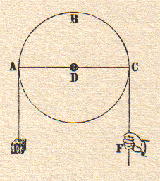 E prima intendasi la girella [carrucola] ABC, fatta di metallo o legno duro, volubile intorno al suo assetto, che passi per il suo centro D, ed intorno a questa girella posta la corda EABCF, da un capo della quale penda il peso E, e dall’altro intendasi la forza F: dico, il peso essere sostenuto da forza eguale a sé medesimo, né la girella superiore ABC apportare benefizio alcuno circa il muovere o sostenere il detto peso con la forza posta in F. Imperò che se intenderemo dal centro D, che è in luogo di sostegno, esser tirate due linee sino alla circonferenza della girella ai punti A, C, nei quali le corde pendenti toccano la circonferenza, averemo una libra di braccia eguali, essendo li semidiametri DA, DC eguali, li quali determinano le distanze delle due suspensioni dal centro e sostegno D; onde è manifesto, il peso pendente da A non poter essere sostenuto da peso minore pendente da C, ma sì bene da eguale, perché tale è la natura dei pesi eguali, pendenti da distanze eguali: ed ancorché nel muoversi a basso la forza F si venga a girare intorno la girella ABC, non però si muta 1′ abitudine e rispetto, che il peso e la forza hanno alle due distanze AD, D C ; anzi la girella circondotta doventa una libra simile alla AG, ma perpetuata.