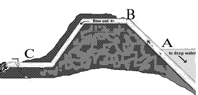 Ebbene, nel primo caso, l’acqua proveniente da A va, attraverso il sifone in giù, a B perché B è comunque ad un livello più basso rispetto ad A. I romani, vuoi per esperienza o per pura casualità, non realizzarono mai acquedotti in cui il livello B della figura fosse più alto di 10 metri (all’incirca) rispetto a quello A. Nel secondo caso, quello del sifone in su(7), se si vuole portare l’acqua da A a C, passando attraverso il sifone, è necessario che il dislivello esistente da dove si prende l’acqua, A, fino alla massima quota a cui arriva il sifone, B, non superi quei 10 metri. Come capirà Baliani, indipendentemente da Torricelli e per altra via, è il peso dell’aria sulla superficie dell’acqua in A che permette all’acqua di salire fino ai circa 10 metri (e non oltre perché il peso dell’aria, la sua spinta, non ce la fa ad andare oltre e, se si vuole farlo, occorre aumentare la spinta dell’aria mediante pompe).