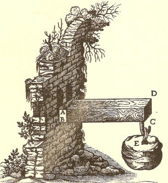 per impulso, si fa montar l’acqua, tuttavolta che l’ordigno impellente sia accomodato da basso in B. Quando l’acqua si abbia a cacciar per impulso, si potrà sollevare e spignere a qualsivoglia altezza, anco di 1000 braccia [un braccio fiorentino = 0,583 m; n.d.r.], purché il cannone sia saldo e forte, siché non crepi: ma nell’alzarla per attrazzione ci e’ una determinata altezza e lunghezza di canna, oltre alla quale e’ impossibile far montare l’acqua un sol dito, anzi un sol capello; e tale altezza parrai che sia circa 40 piedi, e credo ancor meno [in realtà 32 piedi ~ 10 metri; n.d.r.].