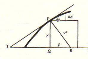 L’ispirazione sembra gli sia venuta dal riflettere sul confronto dei triangoli caratteristici proposti da Barrow per trovare una tangente ad una curva e da Pascal per trovare la quadratura dei seni. Barrow esponeva un suo metodo per trovare le tangenti ad una curva. Il metodo si basa sul triangolo differenziale (o triangolo caratteristico)riportato in figura. Per trovare la tangente si opera nel modo seguente (riporto quanto riassume Boyer).
