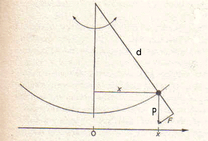 In figura è mostrato un pendolo la cui sferetta è stata spostata dalla sua posizione di equilibrio di un tratto x. Dalla similitudine dei due triangoli rettangoli che compaiono, si ricava la proporzione: