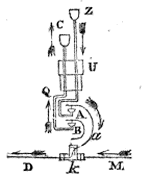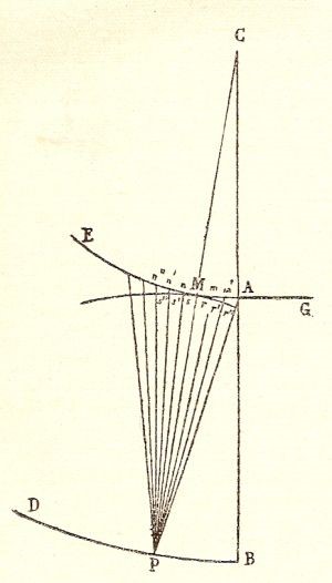 La figura mostra che la corrente del circuito fisso entra in V. Da V va a finire al punto Z che abbiamo visto precedentemente. Segue il circuito precedentemente descritto ZADFGMBC. Da C la corrente ritorna al circuito fisso passando per quella lettera che si legge poco, I , quindi in L, quindi per l’altra lettera che si vede poco chiaramente, R. In questa bilancia la spira può ruotare intorno al sistema di sospensione potendo evidenziare gli effetti di una corrente rettilinea fissa, PL, con una corrente rettilinea, DF, che ora può ruotare con maggiore libertà non avendo vincoli gravitazionali come nella prima figura mostrata.