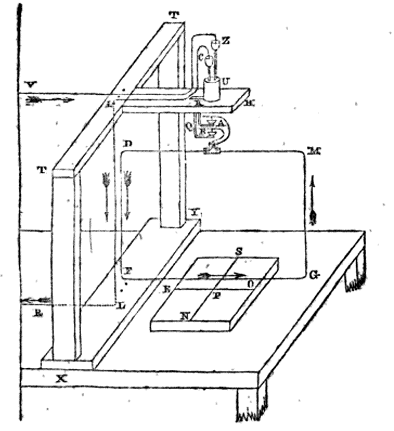 Uno dei primi sistemi ideati da Ampère per studiare le azioni elettrodinamiche tra correnti (bilancia di Ampère). Il conduttore AB è fisso mentre il lato BC della spira BCEF è mobile potendo oscillare lungo l’asse EF, mantenendosi parallelo ad AB. Questa bilancia e le successive mostrate provengono dalla prima memoria di Ampère sulla spiegazione dell’esperienza di Oersted (Mémoire sur les effets des courants électriques, 1820).