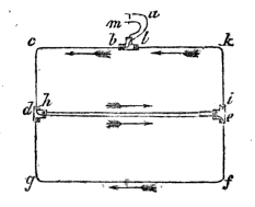 … Se il conduttore mobile, invece di essere costretto a muoversi parallelamente a quello fisso, è libero soltanto di girare su di un piano parallelo a questo conduttore fisso, intorno ad una perpendicolare comune passante per i loro centri, è chiaro che, secondo la legge che abbiamo appena ammesso per le attrazioni e repulsioni delle correnti elettriche, le due metà di ogni conduttore attireranno e respingeranno quelle dell’altro, secondo che le correnti siano concordi o discordi; per conseguenza il conduttore mobile girerà fino a quando esso arriva in una situazione in cui si trovi parallelo a quello fisso, e in cui le correnti siano dirette nello stesso senso: da cui segue che nell’azione mutua di due correnti elettriche l’azione direttrice e l’azione attrattiva o repulsiva dipendono da uno stesso principio e non sono che effetti differenti di una sola e medesima azione.