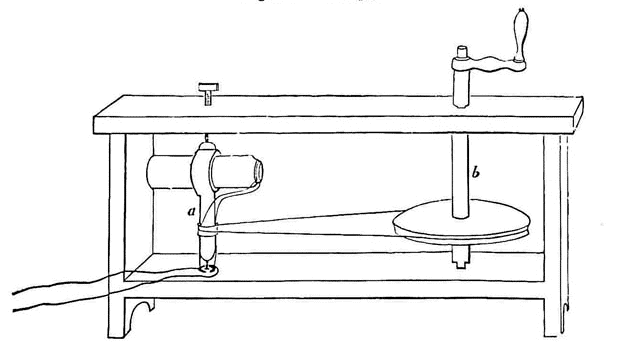 Per fare ciò confrontò i risultati dell’esperienza che aveva proposto nella prima parte della memoria con quella che proponeva ora e che consisteva nel cambiare il meccanismo di rotazione dell’elettromagnete all’interno del tubo di vetro con un sistema meccanico che permettesse di misurare il lavoro fatto con notevole precisione in sostituzione della manovella. Due cordicelle sottili, avvolte intorno ad un cilindro e passanti su due pulegge, erano in grado di far ruotare il medesimo cilindro mediante la caduta di pesi sospesi alle loro estremità. Questo era il sistema che egli utilizzò per sostituire la manovella della precedente esperienza (figura seguente).