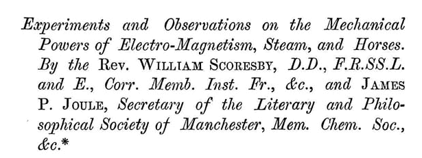 Poiché ancora provava grande curiosità nel confronto fra i rendimenti della macchine a vapore da confrontare con quelli dei motori elettrici, Joule iniziò una collaborazione con il Reverendo William Scoresby, una volta capitano di marina ed esploratore dell’Artico ed ora parroco di Bradford interessato alle scienze (da sottolineare che Joule è uno dei primi fisici a scrivere delle memorie in collaborazione con altri; lo farà anche con Lyon Playfair e Kelvin). Scoresby era famoso per disporre di potentissimi elettromagneti. I due si conobbero ad una riunione della Britsh Association di Manchester nel 1842 e iniziarono a collaborare. Joule voleva far funzionare i suoi motori elettrici con quegli elettromagneti per poter raggiungere il loro massimo rendimento. Ne venne fuori una memoria, Experiments and Observations on the Mechanical Powers of Electro-Magnetism, Steam, and Horses, pubblicata sul Philosophical Magazine nel 1846.