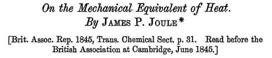 Nel giugno 1845 Joule presentò una comunicazione alla riunione della British Association a Cambridge. Un breve resoconto della comunicazione, On the Mechanical Equivalent of Heat, fu pubblicato nei Brit. Assoc. Rep., trans.