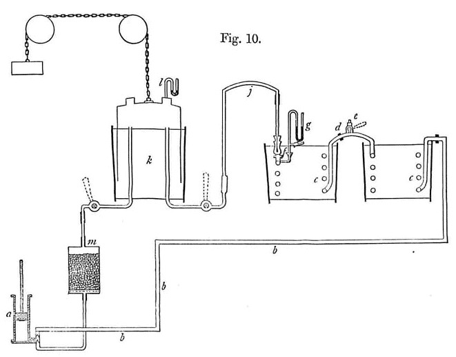Macchina per studiare l’Effetto Joule-Thomson. La macchina a vapore della quale ho parlato nel testo funzionava per alimentare il pistone nel cilindro che compare a sinistra in basso.
