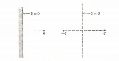 A sinistra abbiamo la situazione iniziale da studiare: una carica puntiforme situata. A destra è la stessa situazione facilitata dall’introduzione della carica immagine che è sistemata specularmente rispetto alla carica data e tale da non modificare la situazione del potenziale del piano indefinito.