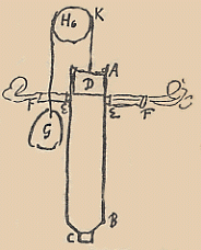 Nella Fig. 11a vi è, con maggior dettaglio, disegnato il cilindro che compare poi in Fig. 11b. Riferendoci a quest’ultima figura descriviamo in breve il funzionamento della macchina a polvere da sparo di Huygens. Il cilindro è B. In esso può scorrere il pistone D che troviamo in alto. Al pistone D è collegata una corda che, passando attraverso una carrucola HG , è collegata ad una massa G. In C vi è della polvere da sparo che può essere accesa con una miccia. Quando si genera l’esplosione, l’aria viene espulsa dal cilindro attraverso gli scarichi EE ed FF. A questo punto, il vuoto creatosi nel cilindro, permette alla pressione atmosferica di spingere il pistone D verso il basso sollevando la massa G. Il fine del lavoro meccanico di sollevamento pesi, acqua o ciò che si vuole è ottenuto. I conti che si era fatti Huygens prevedevano una macchina piuttosto imponente: in C dovevano entrare circa 1500 Kg di polvere da sparo che, esplodendo, avrebbe permesso a D una corsa verso il basso di circa 10 metri.