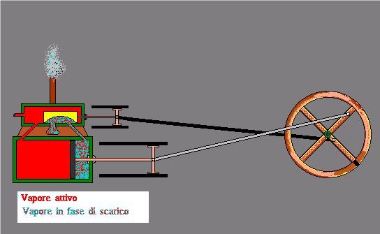 faccia e poi sull’altra del pistone nel cilindro. Riferendoci alla figura, si vede chiaramente il percorso del vapore: in (a) il vapore proveniente dalla caldaia spinge il pistone verso destra; nel far questo sposta anche quel piccolo pezzo (a forma di U rovesciata) che va a chiudere il passaggio proprio a questo vapore e ad aprire la possibilità per esso di entrare dall’altra parte, come mostrato in (b). La cosa si ripete ad ogni spostamento del pistone.