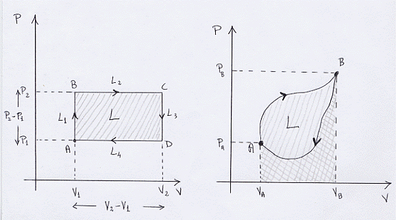 ed è facile rendersi conto che questo prodotto rappresenta proprio l’area tratteggiata in figura III. Si deve osservare che, in pratica, quando abbiamo una trasformazione non chiusa, il lavoro è sempre l’area sottesa tra la curva che rappresenta la trasformazione, i segmenti di perpendicolare all’asse delle ascisse e lo stesso asse delle ascisse. Quando si ha una trasformazione ciclica, accade che, andando da un dato A ad un dato B (ad esempio aumentando il volume), per tornare da B ad A è necessario passare per una qualche trasformazione che riduca tale volume con la conseguenza di sottrarre l’area sottesa da questa ultima trasformazione di ritorno da quella precedente. Riferendoci allora a figura IV si ha che il lavoro L fatto nel ciclo disegnato è dato da: