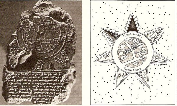 Cerchiamo di capire più in dettaglio questa descrizione dell’universo. Intanto, riferendoci alla figura (c), quel mare primordiale che circonda il tutto, verosimilmente nasceva dall’incessante caduta della pioggia dal cielo e si può ricollegare senza sforzo al mito del diluvio che ebbe proprio origine in Mesopotamia. Vi è poi la cupola che racchiude il cielo. Essa sembrerebbe essere la volta celeste con le sue stelle che, i mesopotamici lo sapevano bene, ruota incessantemente intorno alla Terra ed al Polo Nord celeste (il tramonto di stelle e costellazioni è pensato come un momentaneo occultamento da parte di montagne terrestri. Inoltre, ricorda Pichot, che la rigidità di una cupola è in qualche modo legata al fatto che sia in Egitto che in Mesopotamia il ferro veniva denominato metallo celeste. Riferendoci alla figura (b), non deve stupire che, nella tavoletta, il centro del mondo sia Babilonia; gli eventi politici ed economici avevano reso Babilonia la città più fiorente del mondo conosciuto e, alla data della tavoletta, essa aveva rimpiazzato la Nippur sumera. Intorno a Babilonia vi erano le terre note, l’Assiria, l’Armenia (Urartu), lo Yemen (Habban). Si notano inoltre, le montagne, delle paludi ed un canale che è legato al Fiume Amaro. Ciò che è indicato come Fiume Amaro, dovrebbe essere l’oceano o mare primordiale. Le aree triangolari, al di là dell’ultimo circolo, rappresentano le regioni lontane ed inesplorate. Tali regioni (chiamate isole, in quanto si trovano al di là del mare primordiale) sono localizzate nelle direzioni indicate rispetto a Babilonia. Esse (meno le prime due perché la tavoletta è rovinata) sono descritte sul retro della tavoletta in modo che fa intendere la scarsa conoscenza di esse da parte di Babilonia. L’Egitto dà maggiori particolari mitologici. Il giorno della creazione, il dio Shu sollevò il rigido soffitto celeste fino a farlo diventare una cupola che racchiudeva l’universo. Su questa cupola iniziarono a scorrere le acque (del Nilo superiore) che alimentano da ogni parte la Terra e che sgorgano dalle montagne circostanti l’universo medesimo. I pianeti e tutti gli astri navigano con i loro battelli su queste acque superiori, inseguendo Orione. Le stelle erano dei lampadari appesi al soffitto rigido ed erano accese da un dio per illuminare la Terra.