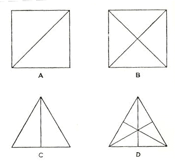 Ora, mentre per il triangolo rettangolo isoscele non vi sono problemi, per quello scaleno ve ne sono; essi possono infatti essere, al contrario degli altri, della più incredibile varietà. Com’è possibile allora decidere per quello con angoli di 90°, 60°, 30°? Semplicemente perché è (letteralmente) il più bello. E la bellezza di questo triangolo discende soprattutto dal fatto che, se ripetuto sei volte, realizza un triangolo equilatero (figura D seguente). Occorre osservare che Platone non realizza il triangolo equilatero nel modo più semplice mediante due soli dei triangoli suddetti (figura C seguente). Da questi due triangoli si generano le quattro entità che sono alla base della costituzione del mondo: terra, acqua, aria, fuoco. Per vedere come, occorre intanto osservare che quattro triangoli rettangoli isosceli, uniti tra loro attraverso l’angolo retto, formano un quadrato (figura B seguente). E’ anche qui da notare che il quadrato non è costruito nel modo più semplice, mediante due triangoli rettangoli isosceli (figura A seguente). Ma siamo ancora al