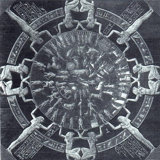 Vi è una immagine all’interno di un tempio, quella di Hathor a Dendera, che è stata oggetto di svariate speculazioni paranormali (come del resto la Grande Piramide di Giza), la quale riporta uno Zodiaco. E’ la sola mappa completa del cielo antico che abbiamo e risale ai primi secoli a.C. in Egitto. Esso mostra lo zodiaco classico circondato dalle altre costellazioni egizie, ma le figure non sono ancora quelle tipiche della tradizione greco-latina ma identiche alle pittografie delle pietre di confine mesopotamiche (kundurrus) risalenti a circa il 1350 a.C.. In definitiva lo zodiaco di Dendera può essere considerato una copia completa dello zodiaco mesopotamico (e su questo sono d’accordo tutti gli studiosi)